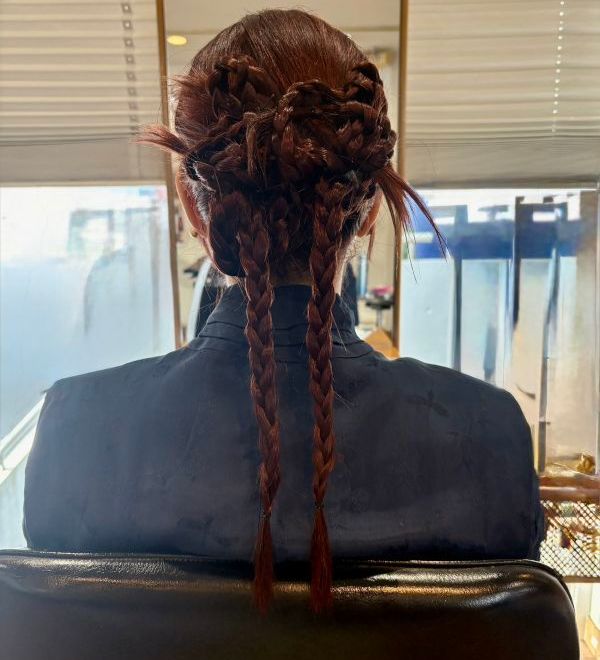 ヘアセットのオーダーが入るのはやはり結婚式のタイミングが最も多いそうで、今トレンドの編み込みスタイル、あえてゆるめに散らしたスタイルなど、人気のヘアセットスタイルならほぼどんなものでも手早く仕上げてもらえます。