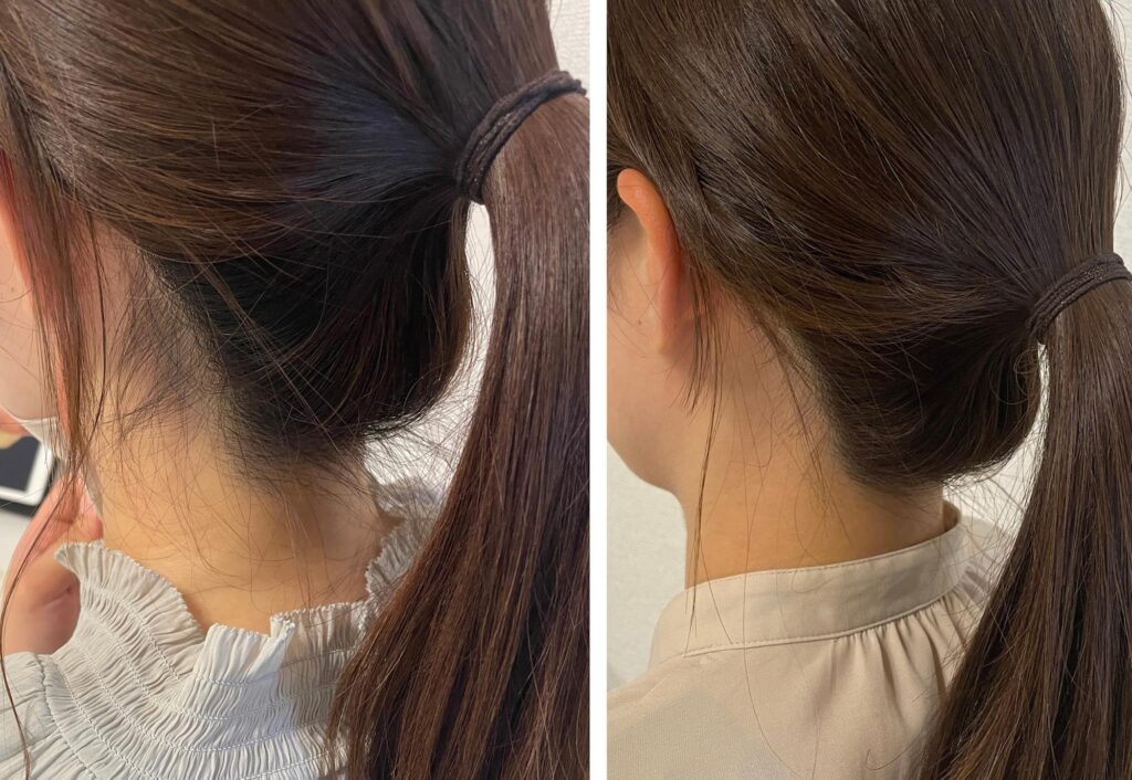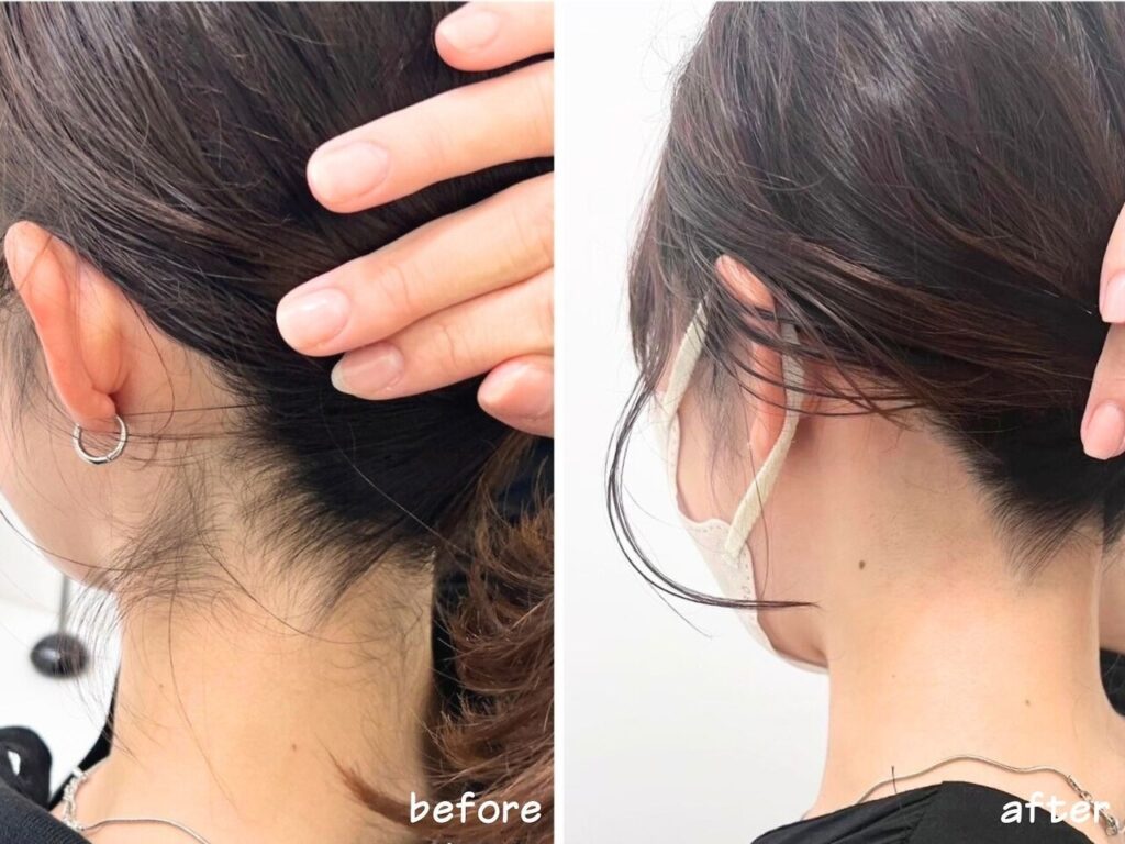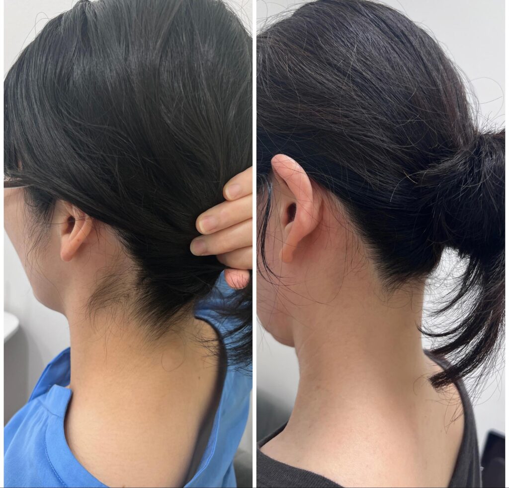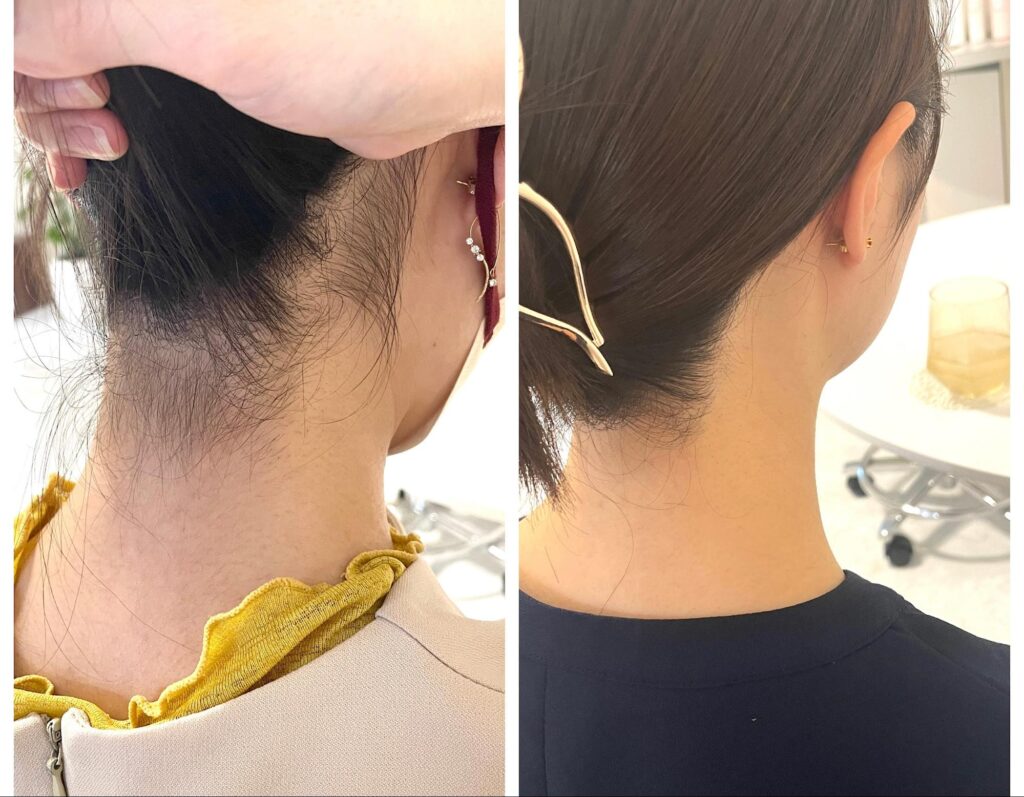 うなじ矯正は、毛を完全になくすのではなく、毛量をコントロールしながら一番似合う形に整えるための施術です。1回目の施術後から、早くもラインの変化や首の見え方の違いを実感される方が多いそう。継続的にメンテナンスすることで、うなじの形状を定着させます。