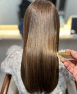 レイルでは、髪質改善トリートメント×ヘアカラーの施術が多くオーダーされています。カラーの染料とともにトリートメントを髪に浸透させ、アイロンを通して仕上げます。